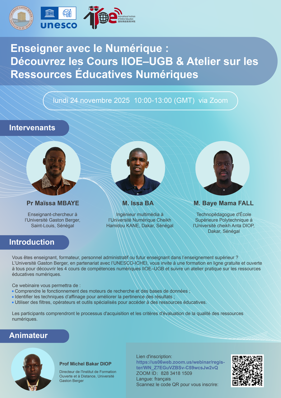 为进一步推动数字技术在非洲高校的有效落地应用,联合国教科文组织高等教育创新中心(UNESCO-ICHEI)将联合加斯顿·伯杰大学(Université Gaston Berger,简称 UGB)于 2025 年 11 月 24 日(星期一)10:00–13:00(GMT) 举办法语专场主题公开课 —— “人工智能赋能个性化教学:解锁数字教育资源”。此次公开课正针对当下教师的核心需求所设计,旨在帮助参会者系统掌握数字资源的检索、筛选、评估与教学应用等关键能力。