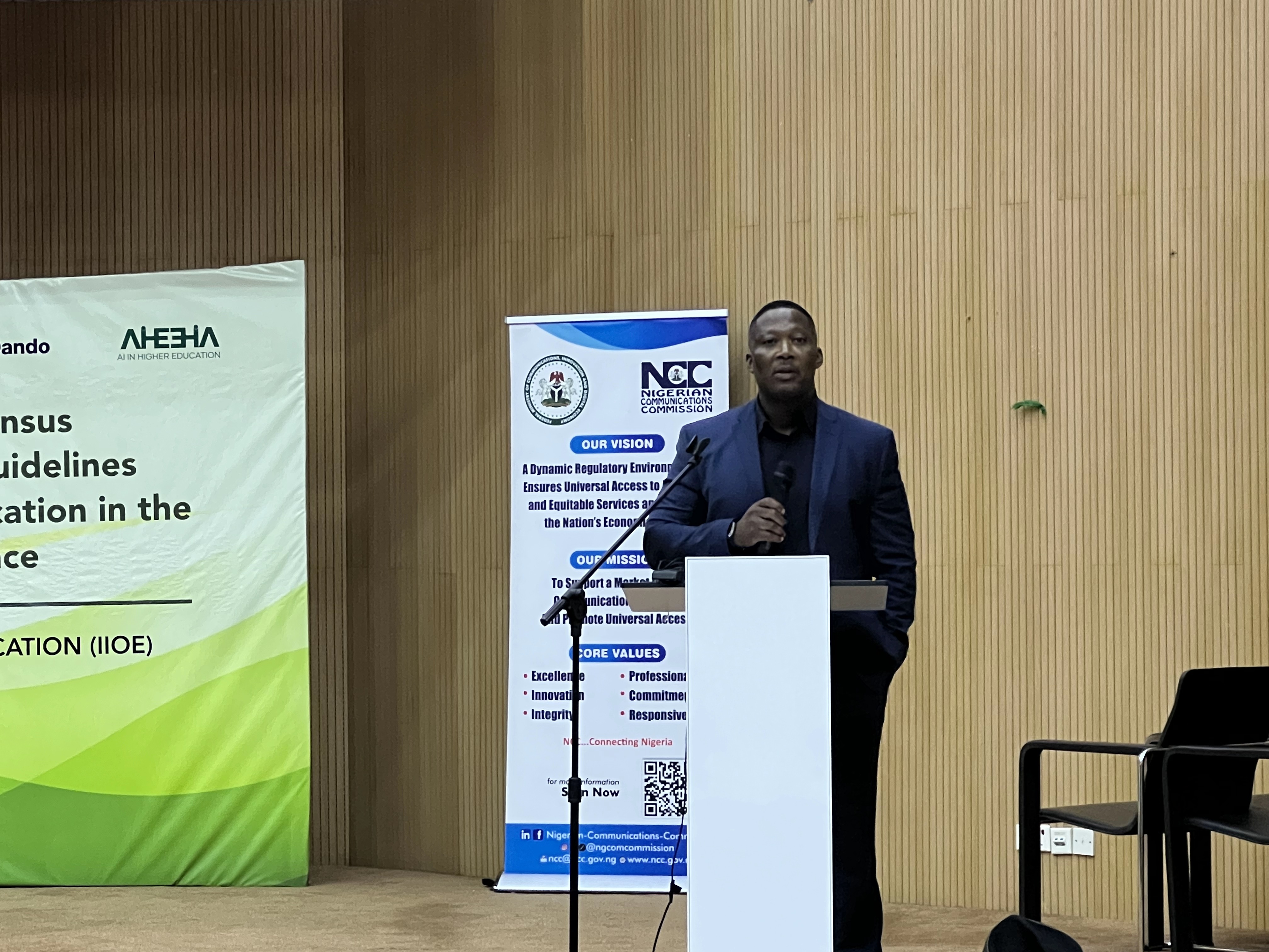 创新中心国际伙伴项目部负责人焦延文先生以“AI时代高等教育工作者的技能提升与再培训以实现数字化转型”为主题进行了主题分享,他强调了人工智能时代下高等教育工作者数字化教学能力的重要性,并介绍了创新中心通过IIOE教学工作者数字技能微证书项目,提供灵活、丰富、可定制化的课程资源、IIOE平台、能力框架及相关指南,支持IIOE国家中心及IIOE伙伴院校根据实际需求开展本地化的教师培训,提高高等教育教师数字化教学能力。他回顾了创新中心与IIOE尼日利亚国家中心的合作过往,对IIOE尼日利亚国家中心开展了多项高校教师赋能活动,试点了IIOE教学工作者数字技能微证书项目本地化实施,累计服务数千人次尼日利亚高校教师表示赞赏,并希望与IIOE尼日利亚国家中心合作在尼日利亚更大范围开展IIOE教学工作者数字技能微证书项目,赋能更多尼日利亚高校教师数字化教学能力。